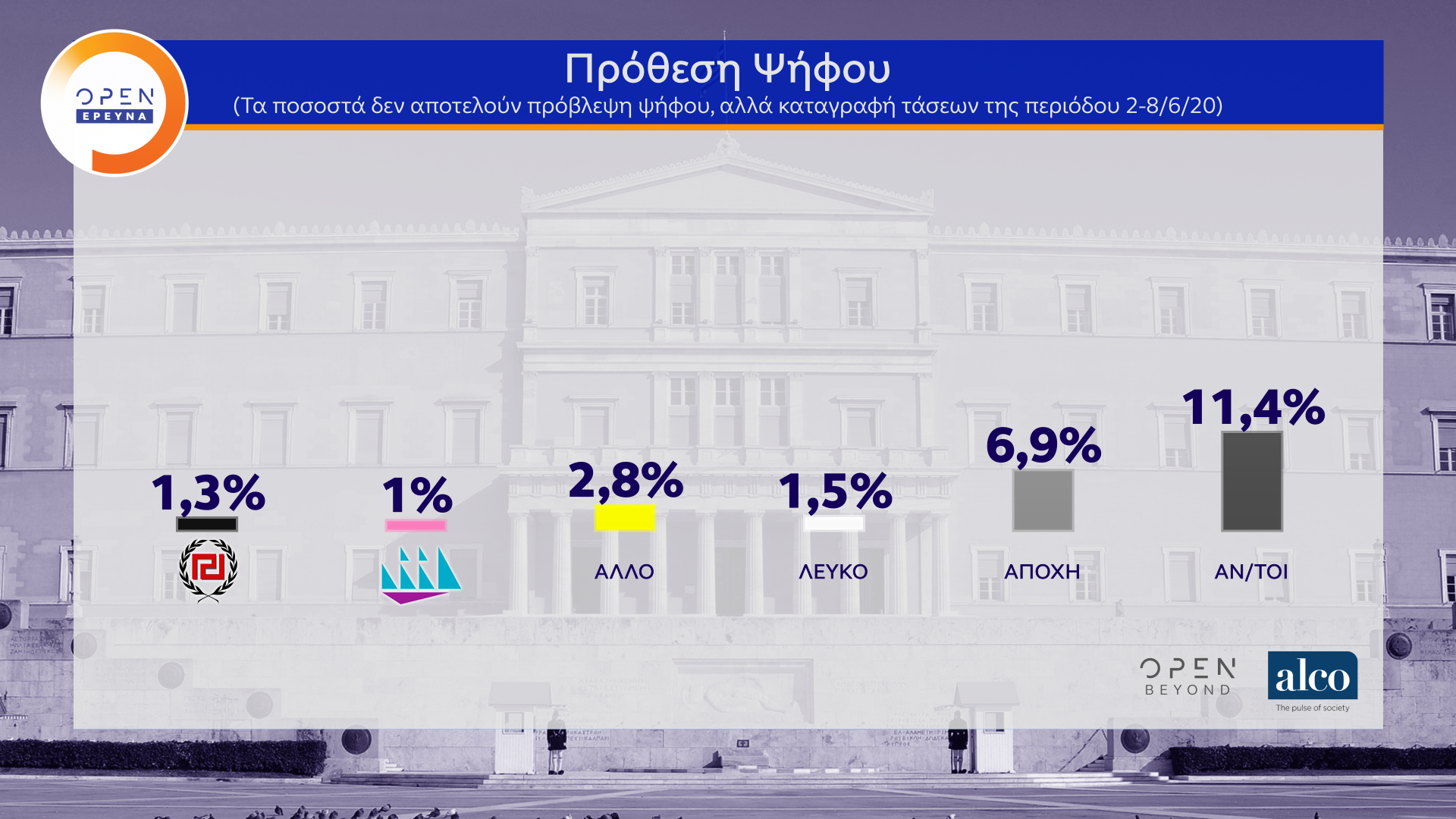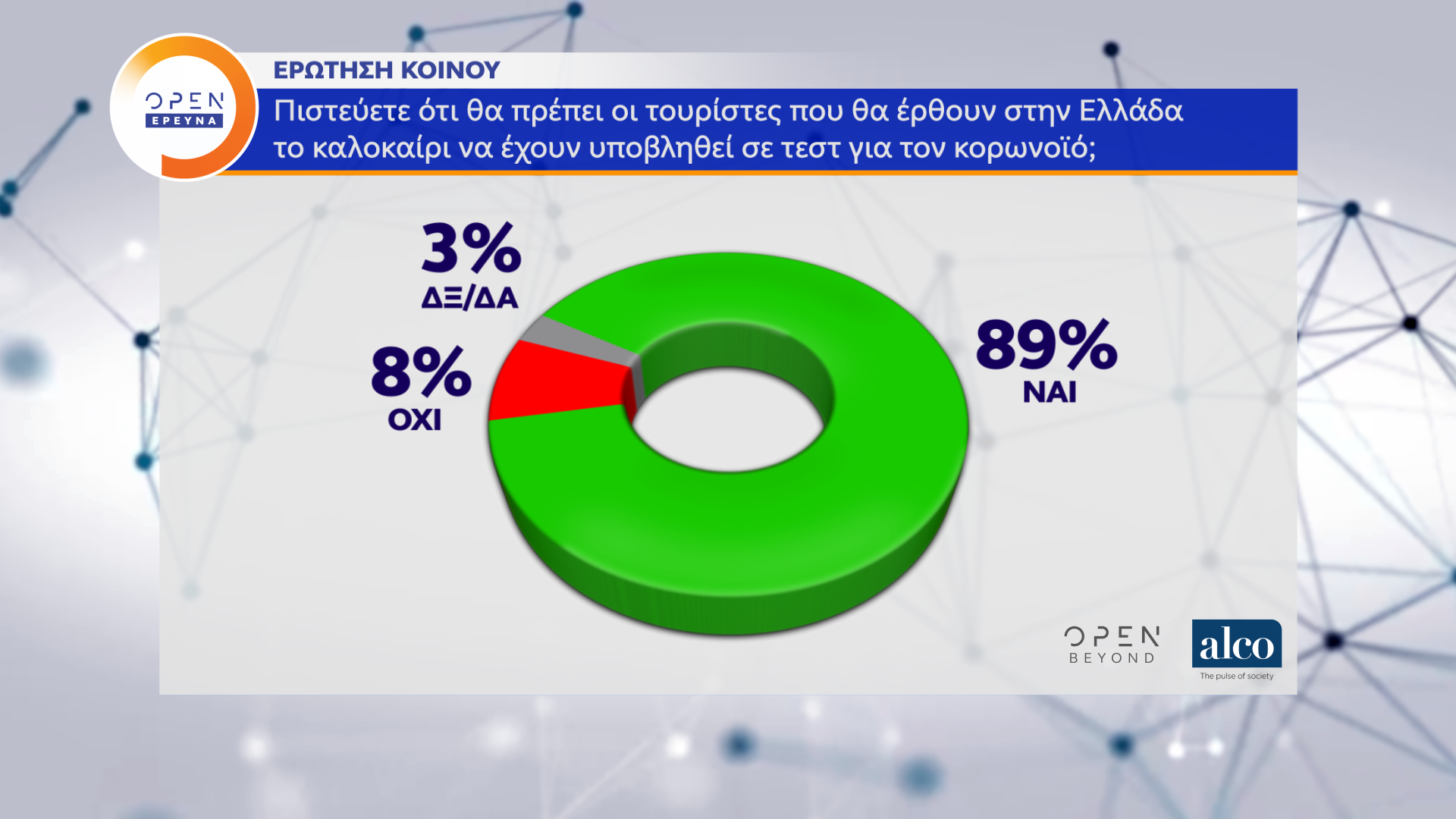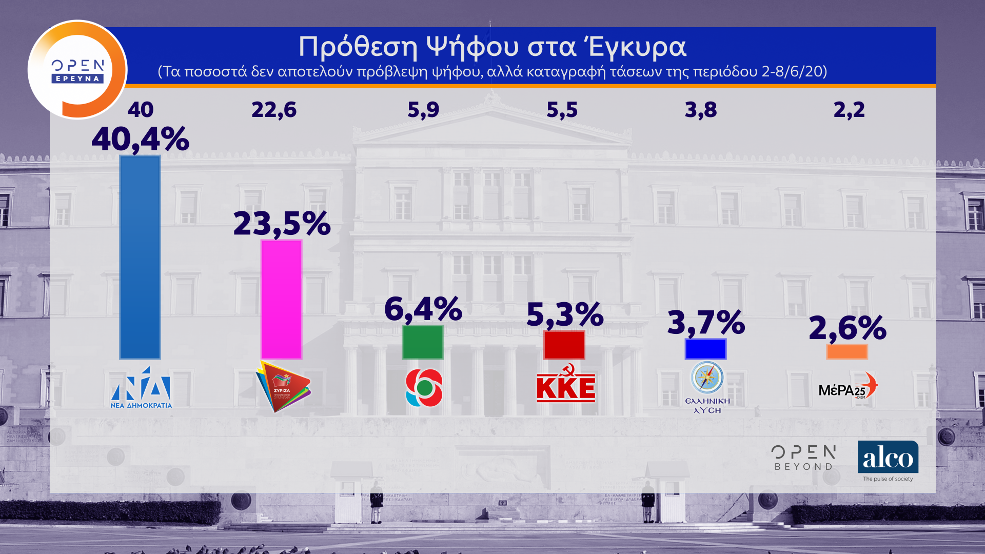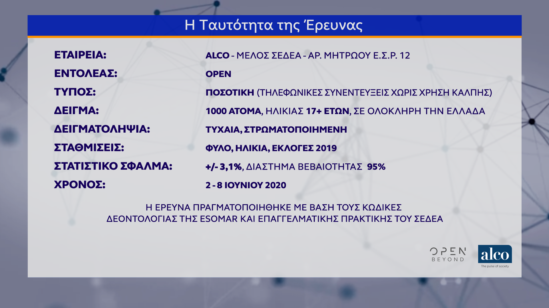 Η μεγάλη δημοσκόπηση του κεντρικού δελτίου Ειδήσεων του OPEN, που διαμορφώθηκε και από ερωτήματα πολιτών, πραγματοποιήθηκε από τις 2 έως τις 8 Ιουνίου 2020 από την ALCO και μεταδόθηκε την Τρίτη 09/06/2020.