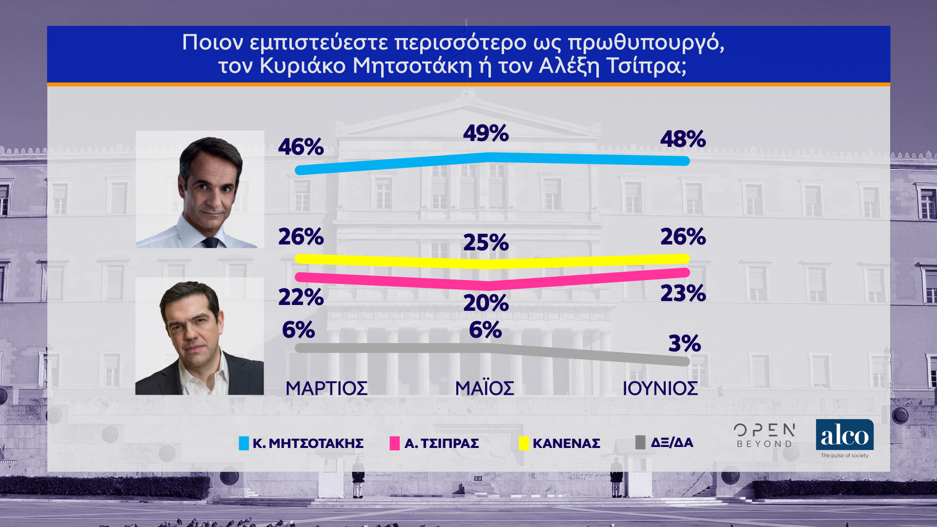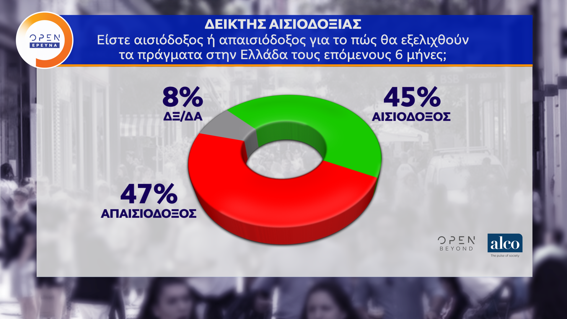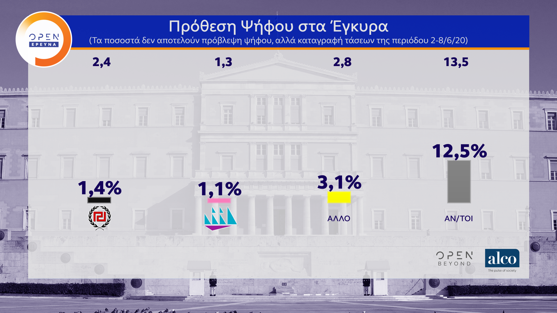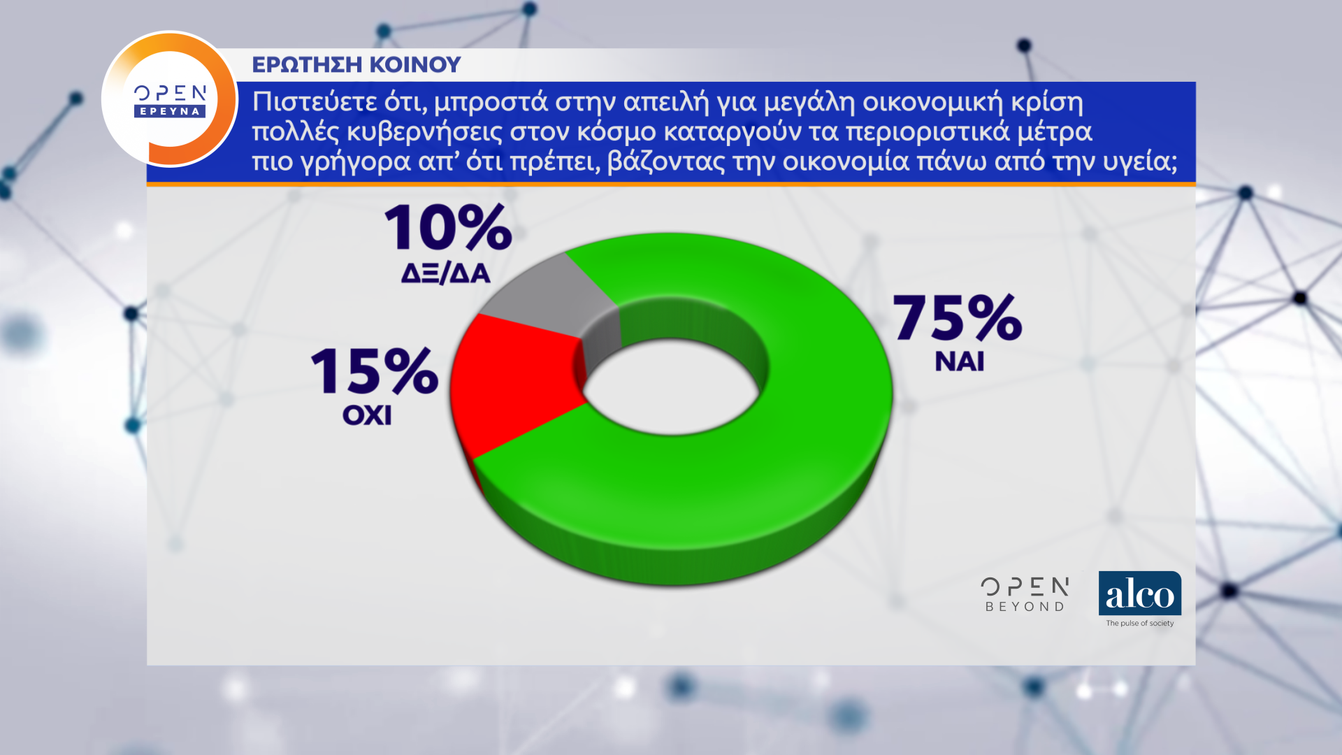 Η μεγάλη δημοσκόπηση του κεντρικού δελτίου Ειδήσεων του OPEN, που διαμορφώθηκε και από ερωτήματα πολιτών, πραγματοποιήθηκε από τις 2 έως τις 8 Ιουνίου 2020 από την ALCO και μεταδόθηκε την Τρίτη 09/06/2020.