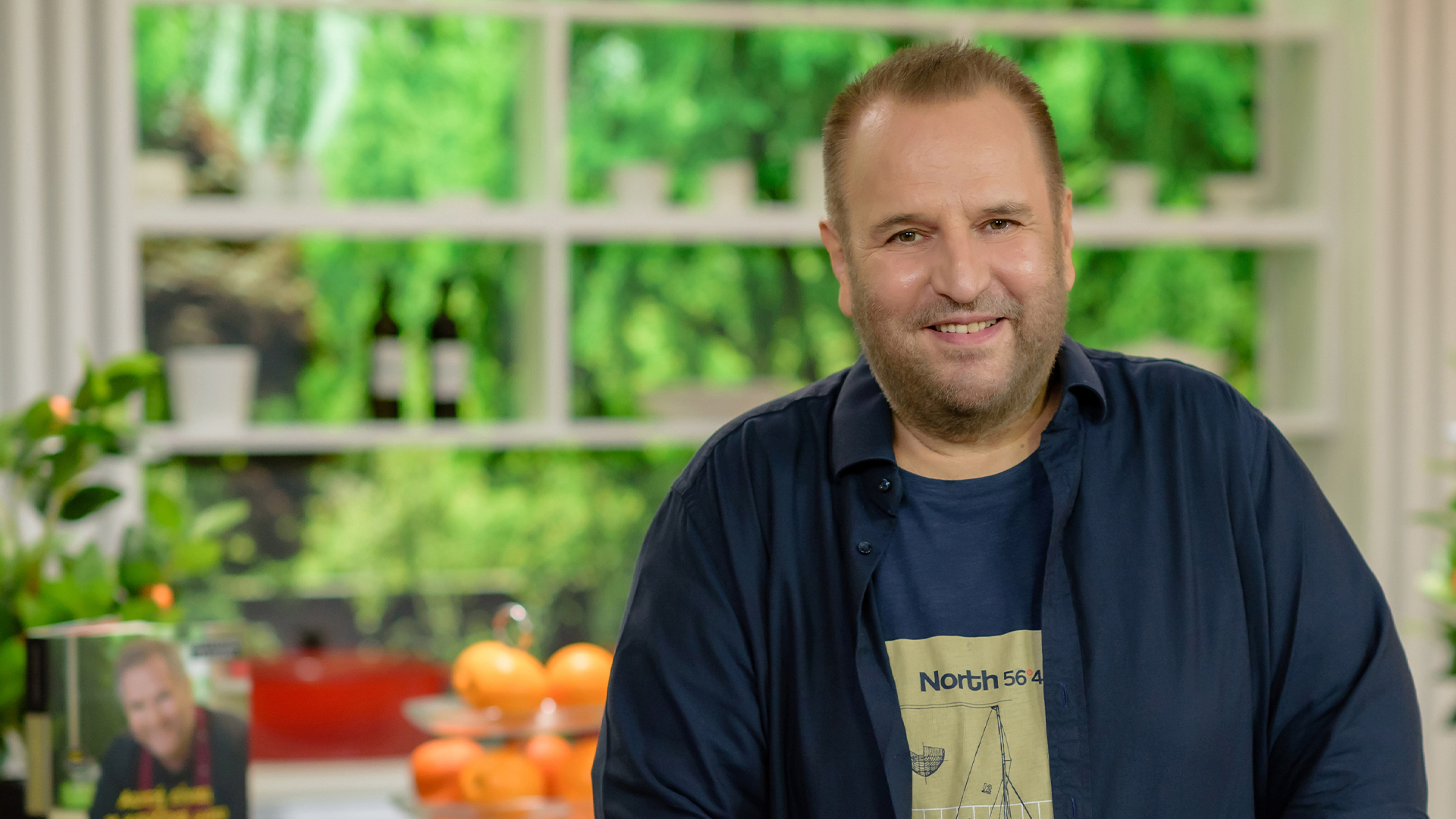 Στην ανανεωμένη του κουζίνα κυριαρχεί ένα μεγάλο παράθυρο με θέα στη φύση για να μοιραστεί με τους τηλεθεατές την αγάπη του για τη μαγειρική.