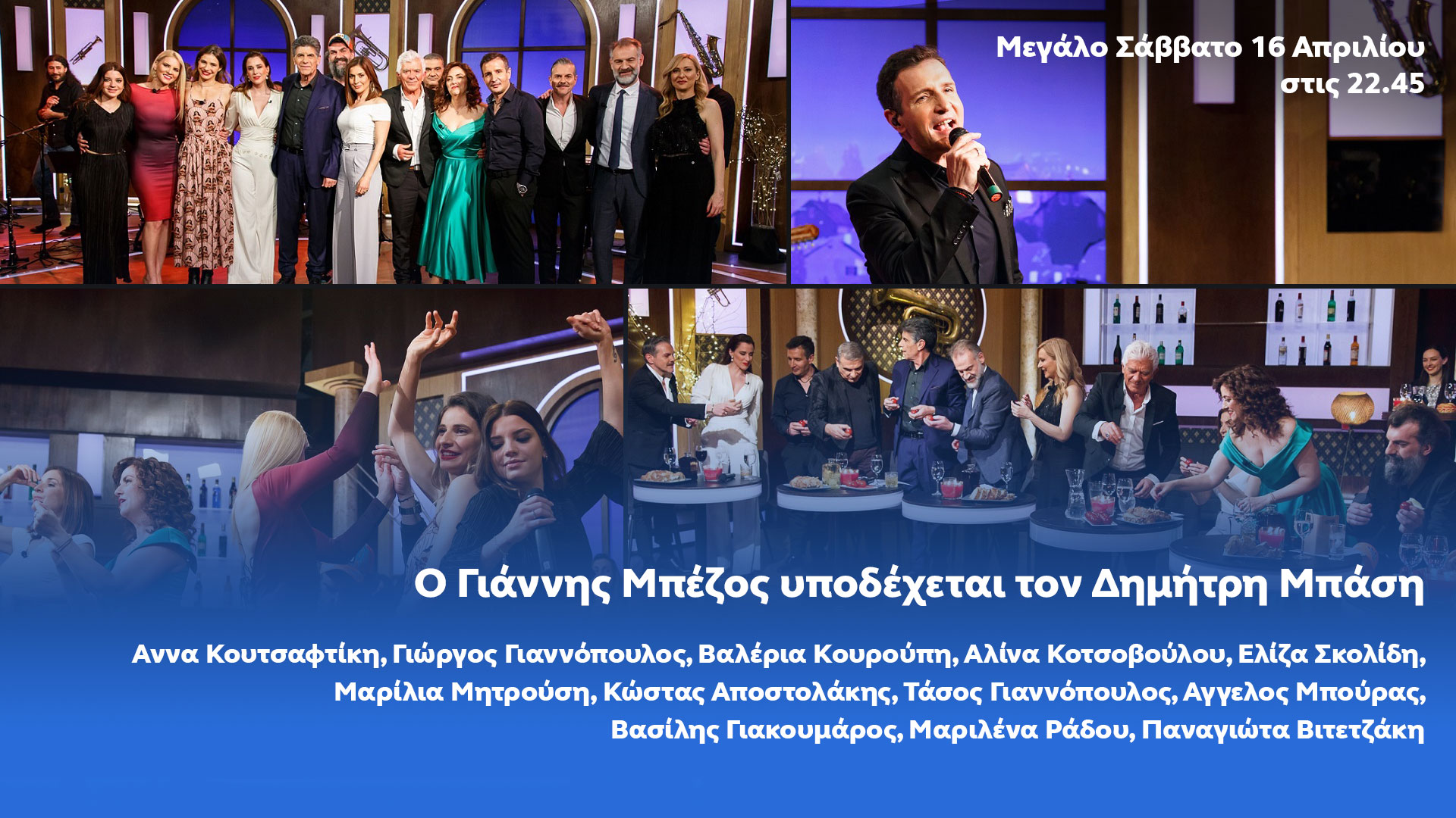 Άννα Κουτσαφτίκη, Γιώργος Γιαννόπουλος, Βαλέρια Κουρούπη, Αλίνα Κοτσοβούλου, Ελίζα Σκολίδη και Μαρίλια Μητρούση, αναλαμβάνουν δράση από μικροφώνου και παρέα με τον Κώστα Αποστολάκη, τον Τάσο Γιαννόπουλο, τον Άγγελο Μπούρα, τον Βασίλη Γιακουμάρο, τη Μαριλένα Ράδου και την Παναγιώτα Βιτετζάκη, ανεβάζουν τη διάθεσή μας, αυτή την αναστάσιμη βραδιά.