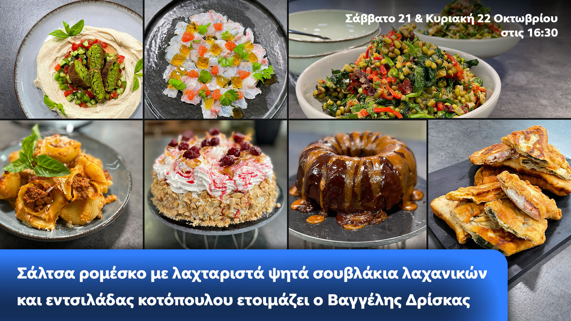 Το Σάββατο 21 Οκτωβρίου στις 16:30 οι γευστικές προτάσεις ξεκινούν με κροκέτες με φασόλια ενταμάμε που σερβίρονται με χούμους ρεβιθιών. Ο Βαγγέλης Δρίσκας μαγειρεύει λαχταριστά κοχύλια φούρνου με κιμά και μπεσαμέλ και στη συνέχεια την περίφημη σάλτσα ρομέσκο με λαχταριστά ψητά σουβλάκια λαχανικών. Στην ενότητα «Εστιατόριο στο σπίτι» μας προτείνει καρπάτσιο λαβράκι με ζελέ λάιμ, ενώ στην ενότητα «Ζαχαροπλαστική για όλους» φτιάχνει την κλασική και εντυπωσιακή τούρτα αμυγδάλου.