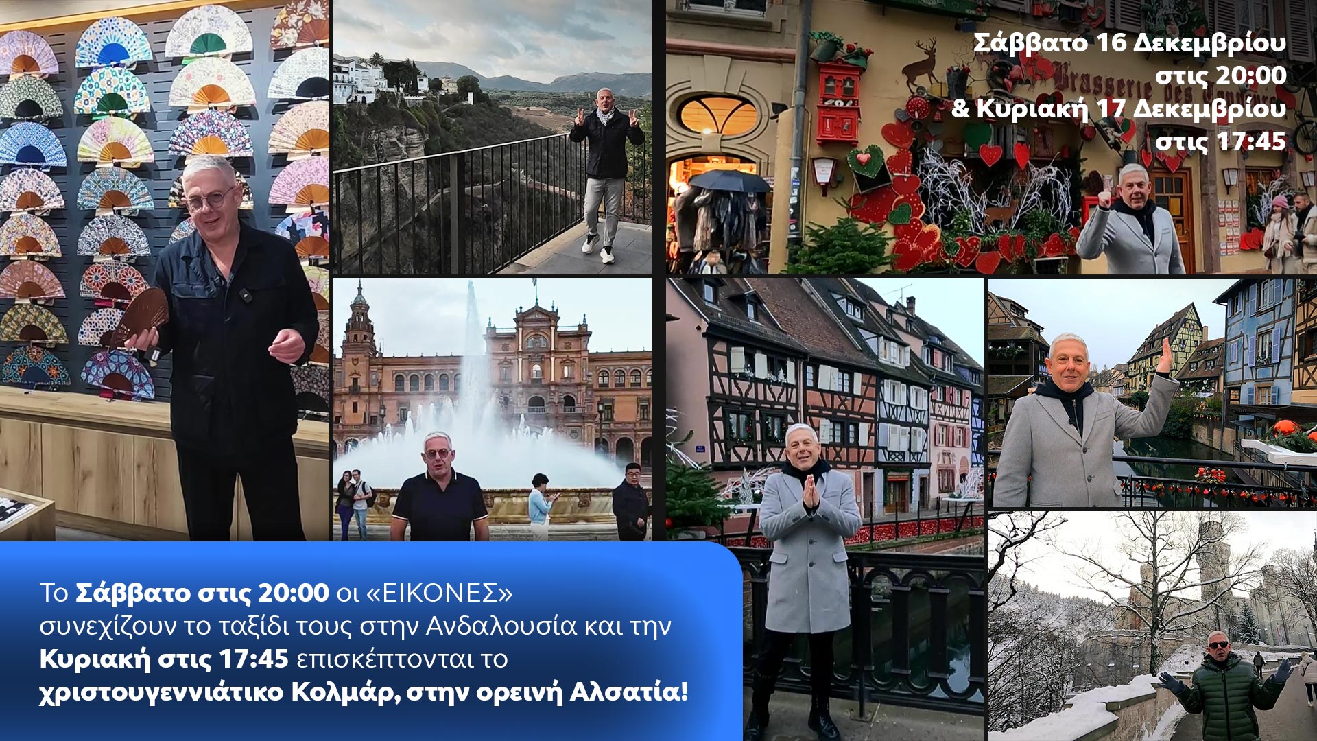 O Τάσος Δούσης και οι Εικόνες έχουν ετοιμάσει και αυτή την εβδομάδα υπέροχες εκπλήξεις και μας ταξιδεύουν σε δύο υπέροχους προορισμούς! Το Σάββατο στις 20:00 οι Εικόνες συνεχίζουν το ταξίδι τους στην Ανδαλουσία και την Κυριακή στις 17:45 επισκέπτονται το χριστουγεννιάτικο Κολμάρ, στην ορεινή Αλσατία!