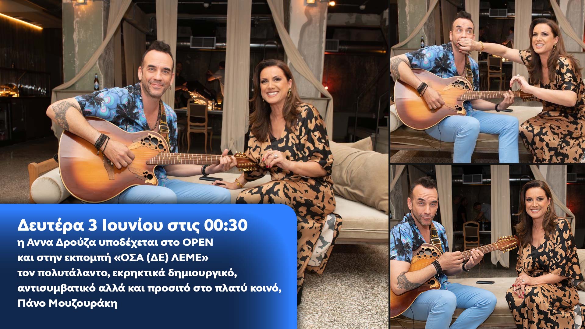 Απόψε μισή ώρα μετά τα μεσάνυχτα, η Άννα Δρούζα υποδέχεται στο OPEN και στην εκπομπή «Όσα (ΔΕ) Λέμε» τον πολυτάλαντο, εκρηκτικά δημιουργικό, αντισυμβατικό αλλά και προσιτό στο πλατύ κοινό, Πάνο Μουζουράκη.